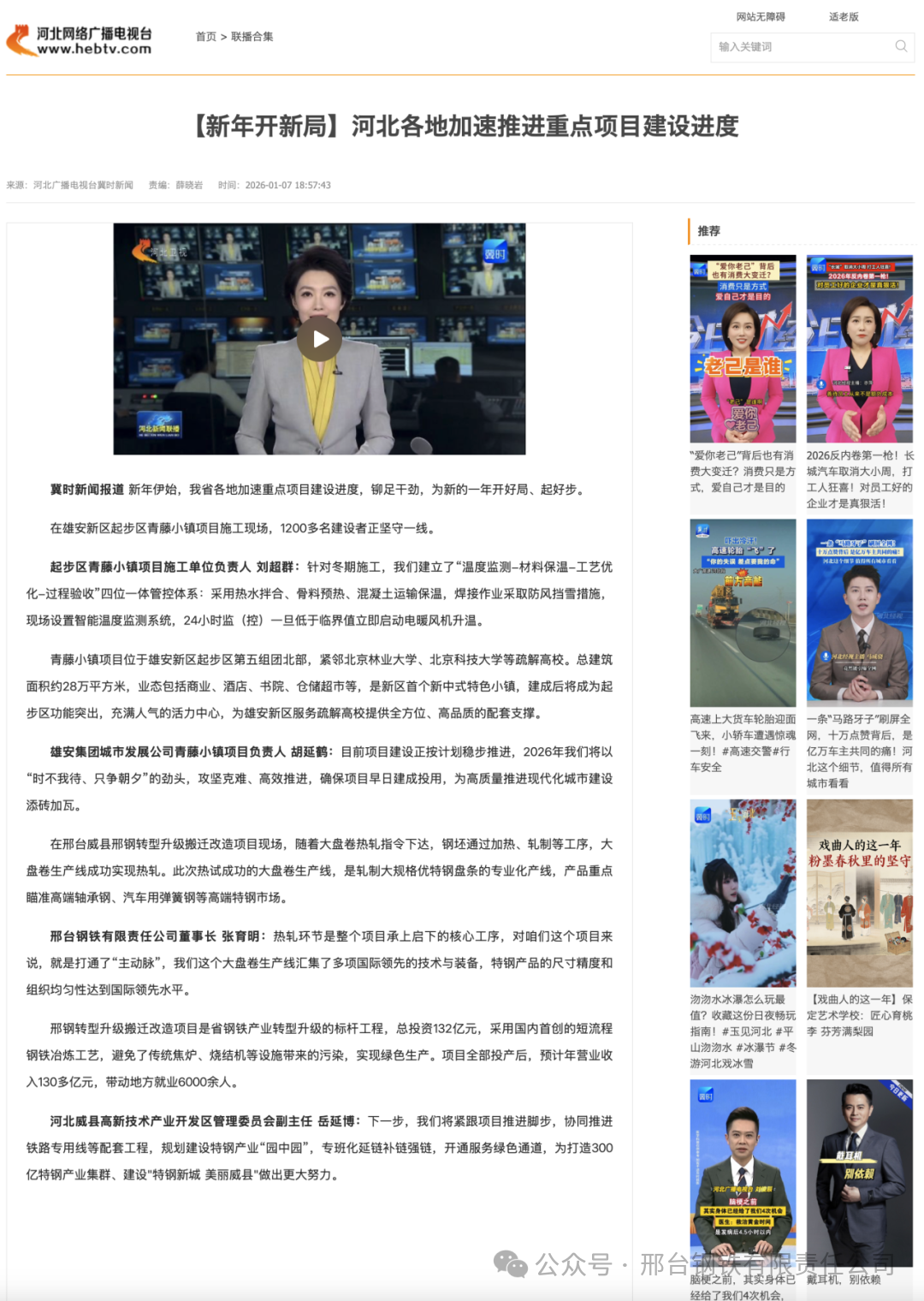 邢台钢铁有限责任公司董事长 张育明:热轧环节是整个项目承上启下的核心工序,对咱们这个项目来说,就是打通了“主动脉”,我们这个大盘卷生产线汇集了多项国际领先的技术与装备,特钢产品的尺寸精度和组织均匀性达到国际领先水平。