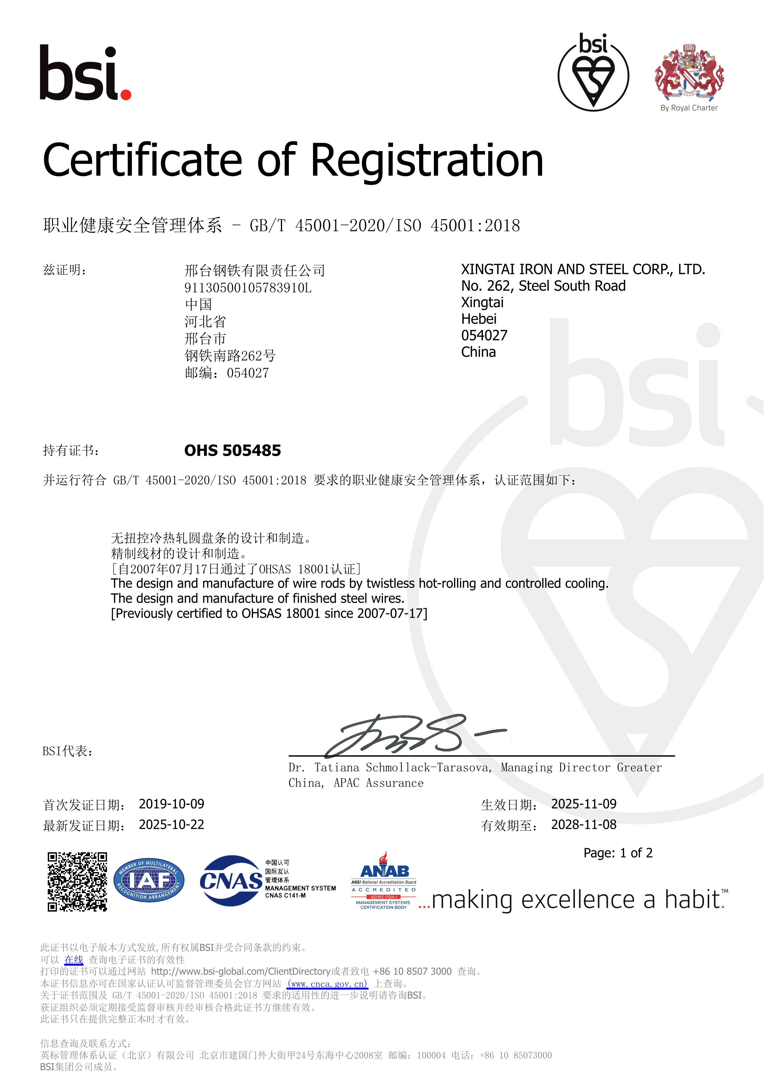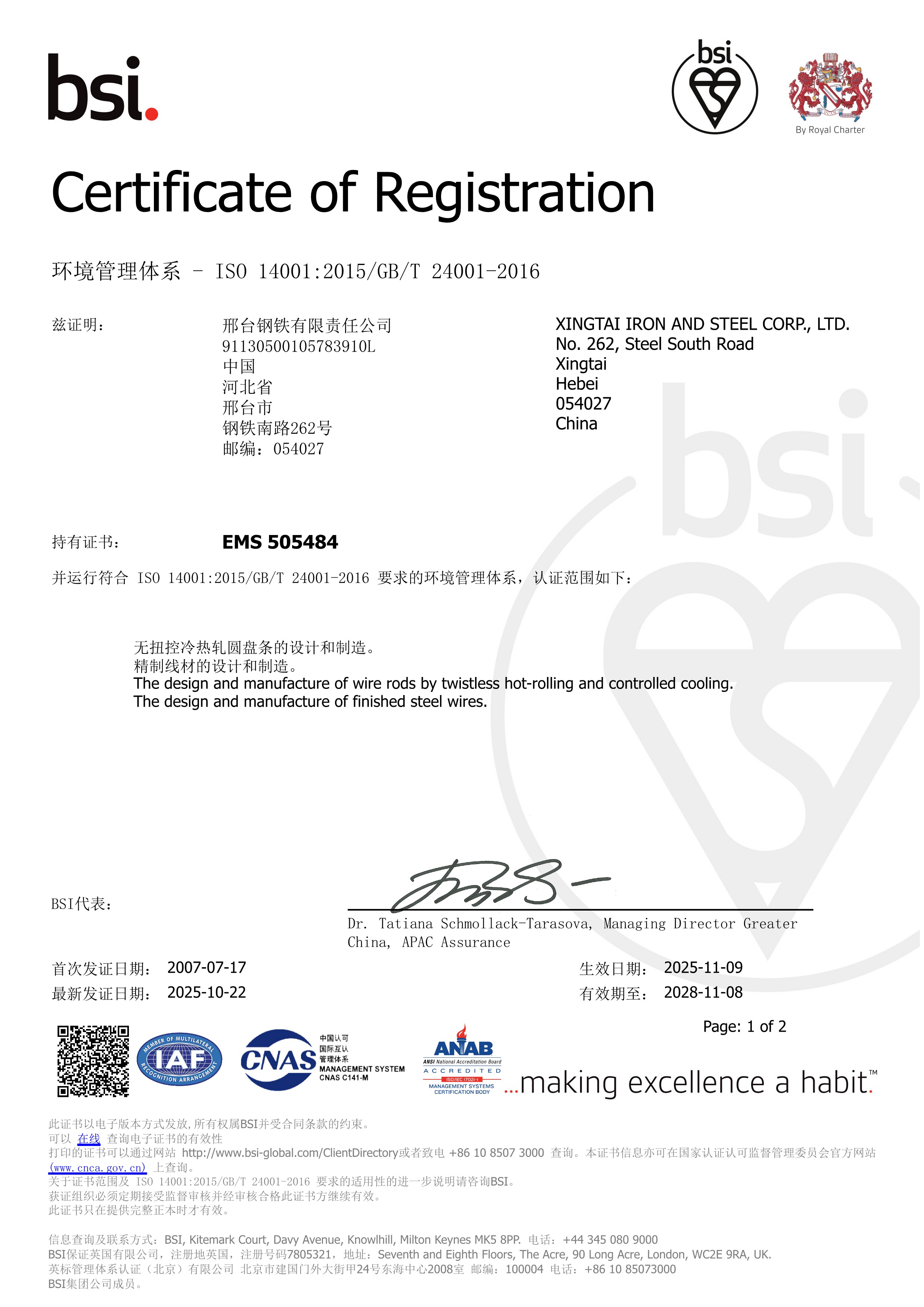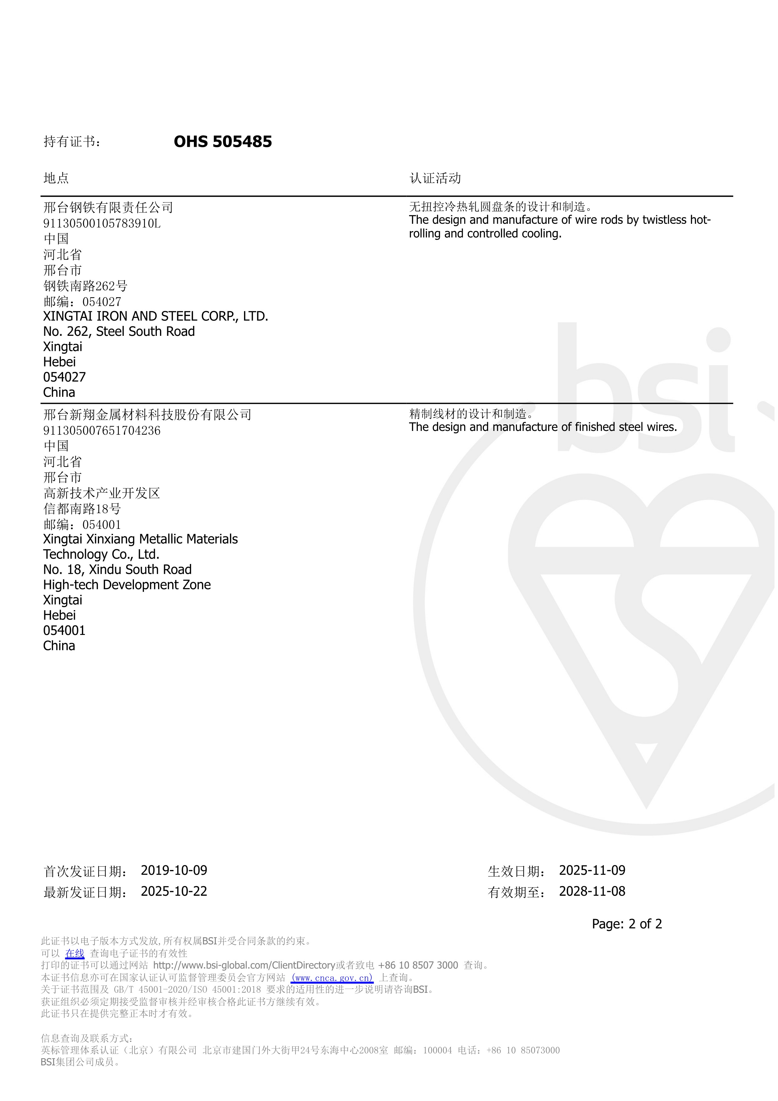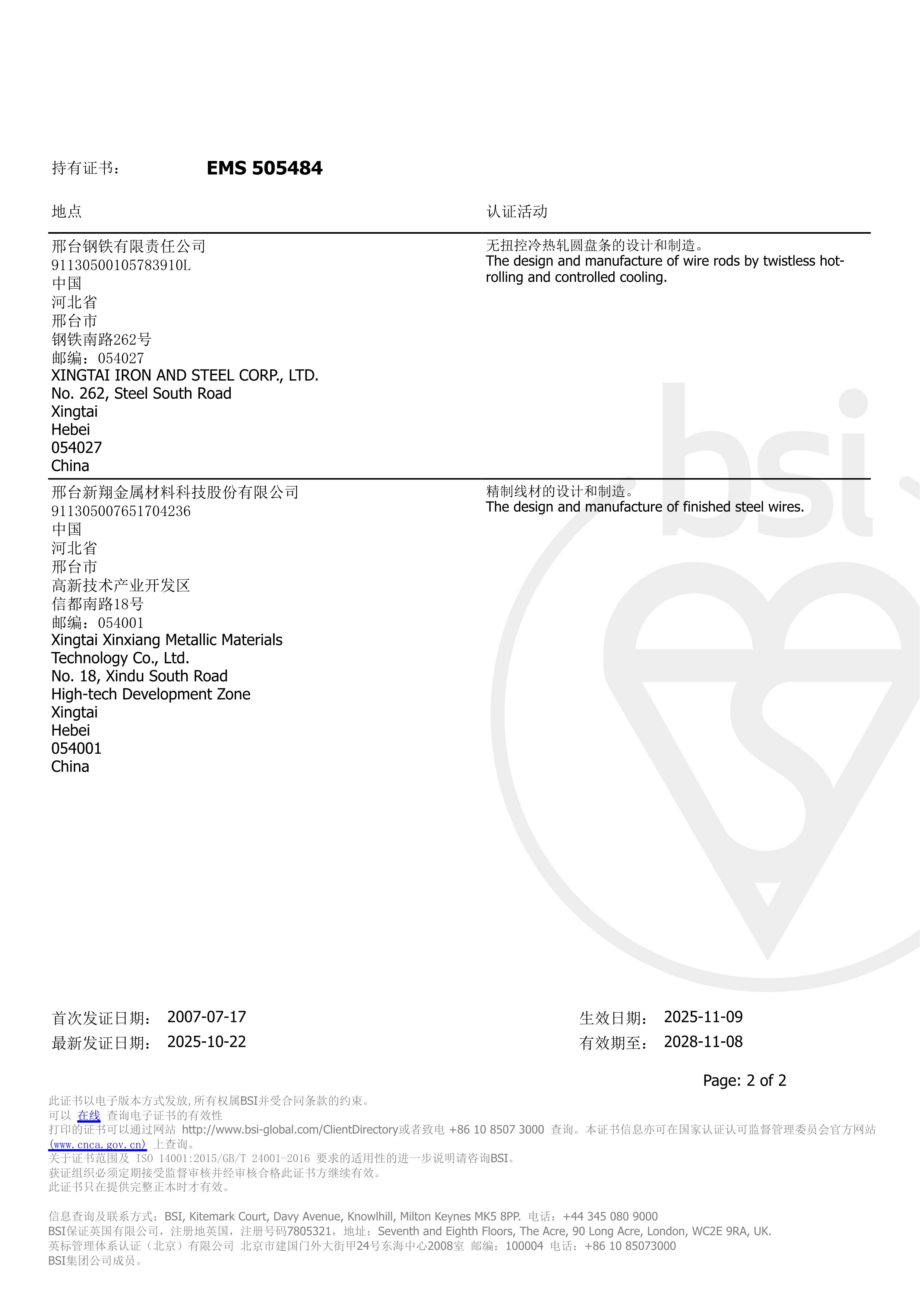 2007年7月17日,邢钢环境管理体系、职业健康安全管理体系顺利通过英标BSI公司认证获得认证证书。