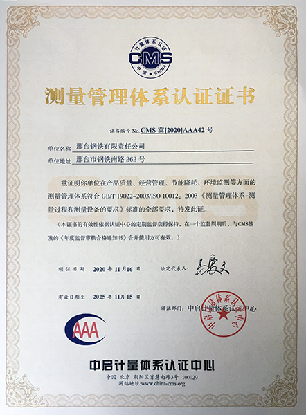 邢钢测量管理体系2006年3月通过GB/T19022-2003/ISO10012:2003认证,其建立和运行实现了与质量管理体系(IATF16949)的有效整合。并于2010、2015、2020年11月顺利通过复审换证。范围包括公司铁、钢、材生产过程的能源管理、工艺监控、质量检验、经营管理、环境保护、安全监控和职业健康所涉及的测量设备和测量过程及支持过程。